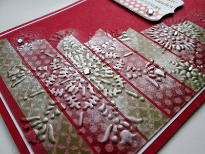 I simply added strips of the tape and ran it through the Big Shot. I found that the snowflakes were a bit lost on the tape so I highlighted them using my Silver Ink pad and a sponge and added some Rhinestones to finish the centres :-)