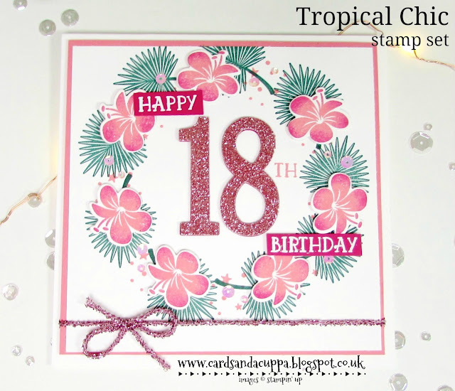 Today is my hubbys birthday but, true to form, I was up 'till late last night making his card so I don't have that photographed yet to show you ;-) Instead I have a card I made for my friends daughters birthday recently using the Tropical Chic stamp set and some glittery numbers, of course...